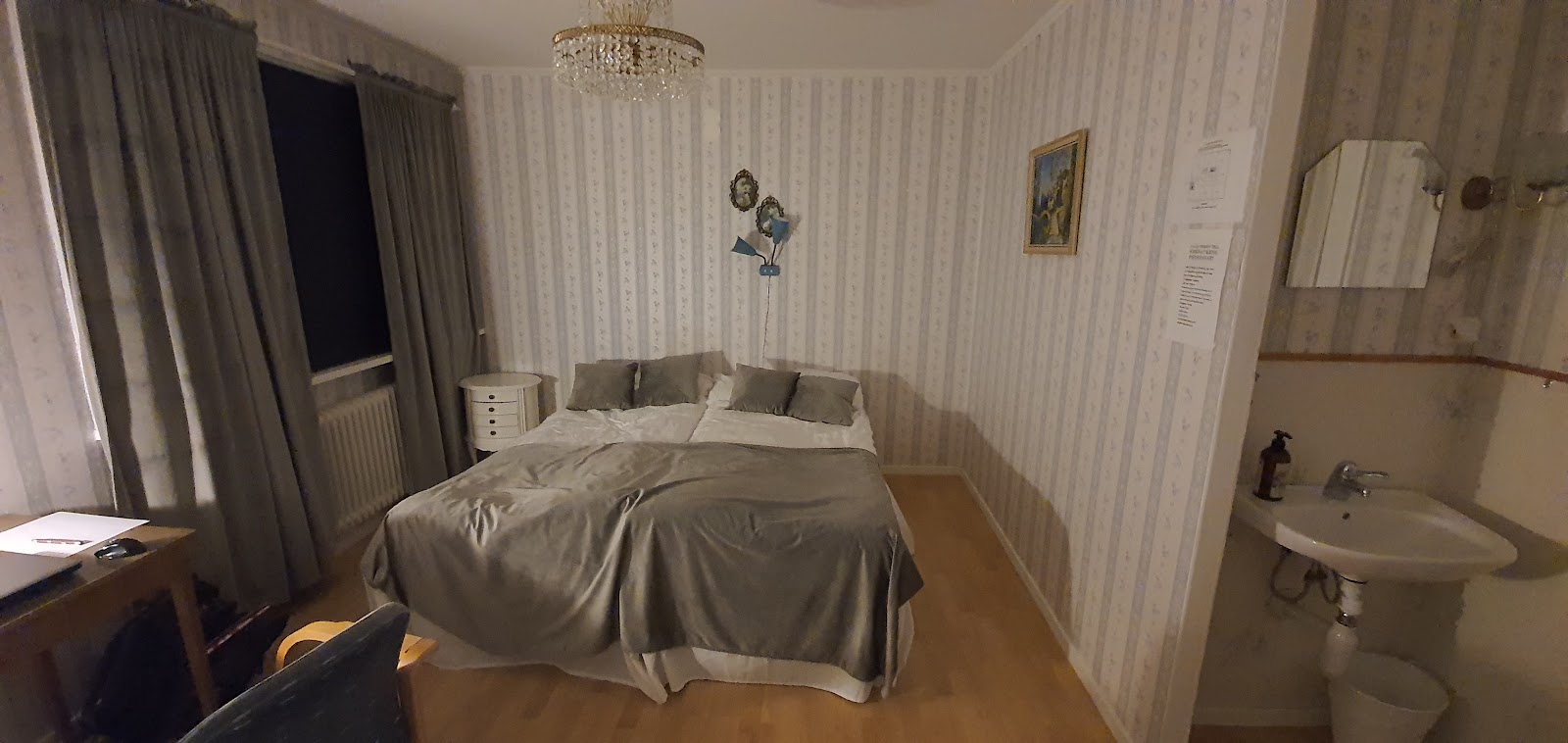 Pensionat med flera rum, dusch, toalett och tvättstuga. Rena lakan och städning ingår.